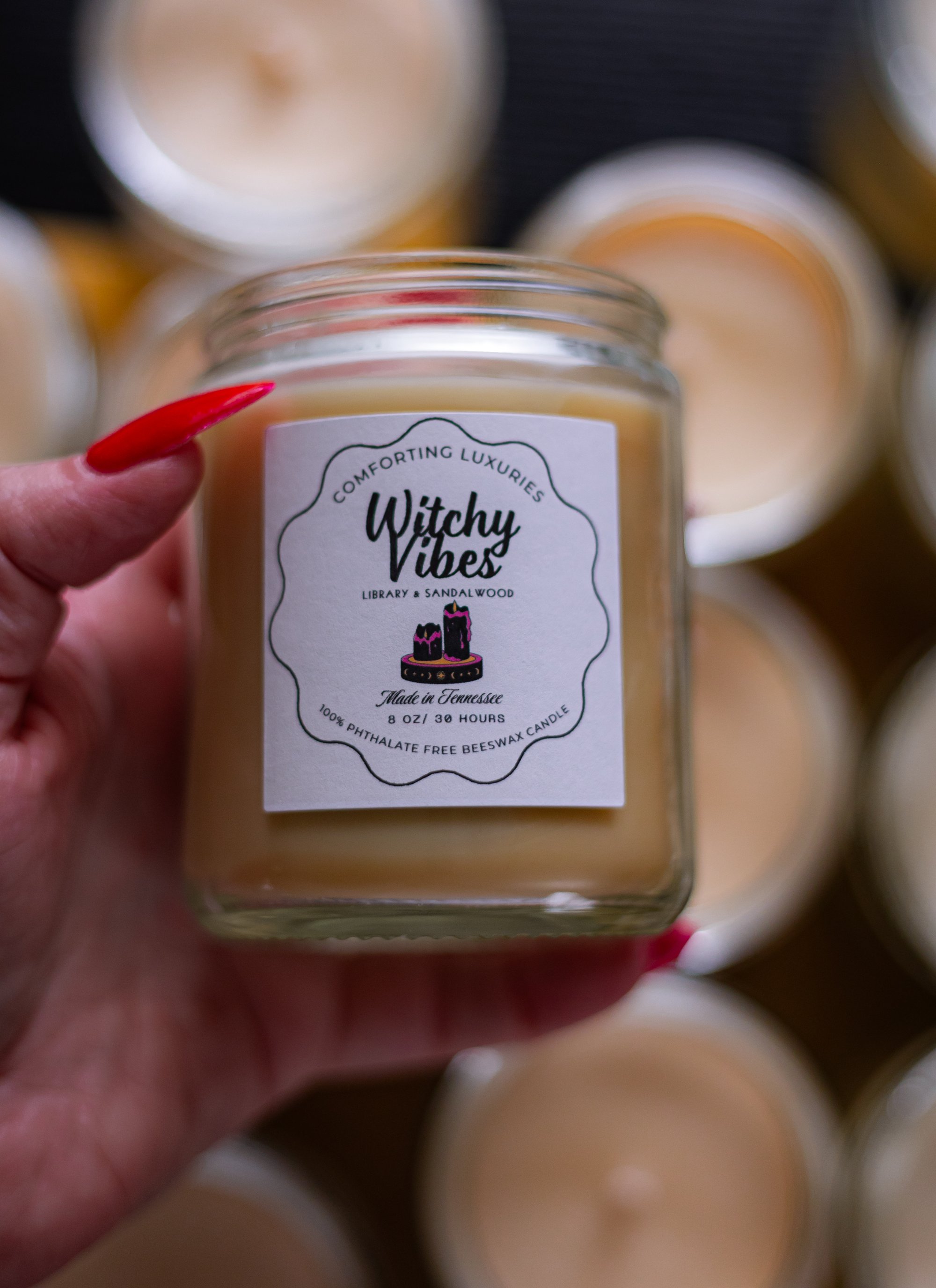 All candles are made with organic beeswax & coconut oil mix and come in an 8-ounce clear glass jar with an organic cotton wick.